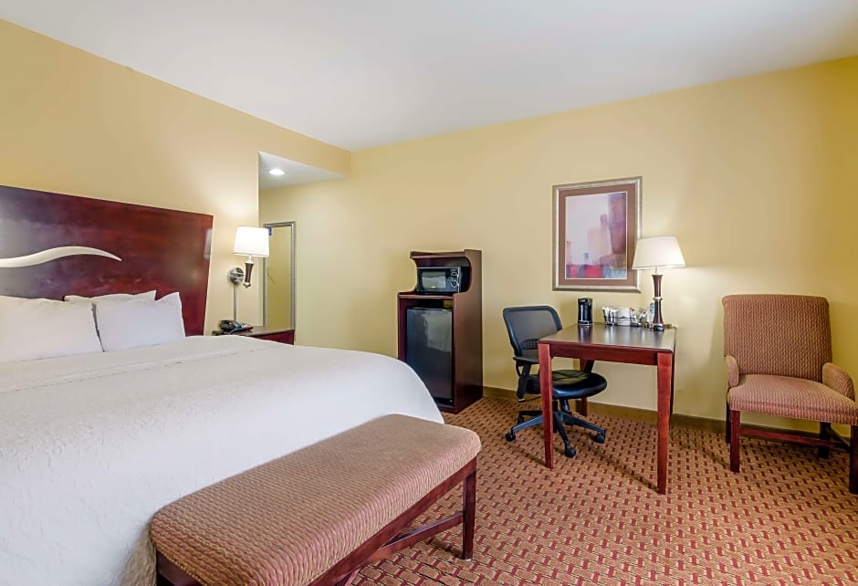 This room features a flat-screen TV with cable channels, a seating area, and a work desk.